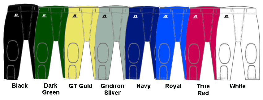 Colors: 92% Nylon/8% Spandex. White: 92% Polyester/8% Spandex. Pant body. 2 1/2 " Elastic tunnel waist with gripper technology. No fly front. Double duke gusset and 3 piece back. Thigh and knee pad pockets. Gathered elastic leg openings. Cover seamed. R Russell right hip. Coordinating ADULT style F2526MF.
